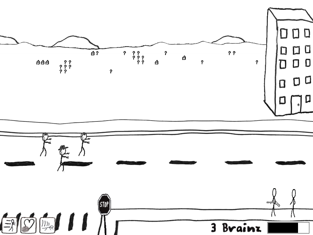 Some of the human opponents are armed with firearms and attack rambling zombies. The player can use gathered human brains to heal himself or to get temporary speed boosts.